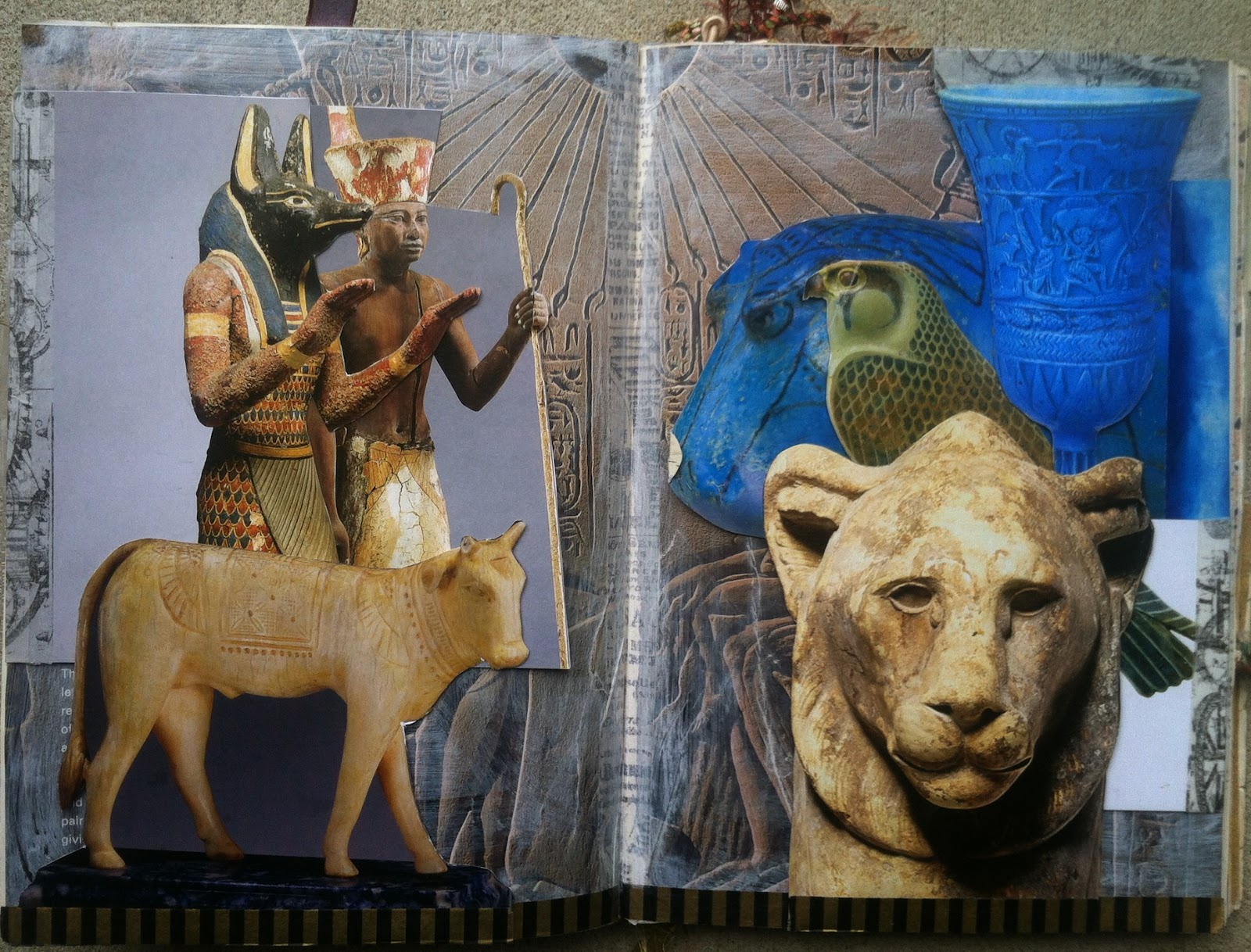 This is the first spread in an altered book I just did with the theme "Egypt". Each piece flips out and has information on the back of what each artifact is.